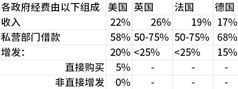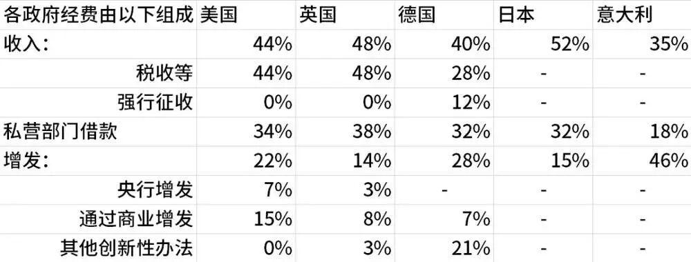 更具体地说,美国参战后,政策制定者立即开始提高公司和个人税率,并向公众发行债务。下表显示了战争期间美国和其他国家/地区的政府资助来源,仅使用了实际战争年份(即美国的1941-45年)中的数据,而忽略了数据极为不可靠的年份(即1945年的德国和日本)。如您所见,他们的税收、借贷和货币发行量都非常大。
