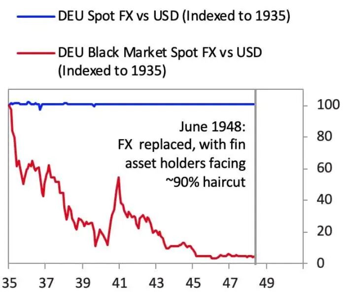红线:以1935年为基准,黑市中,德国货币汇率比美元的变化