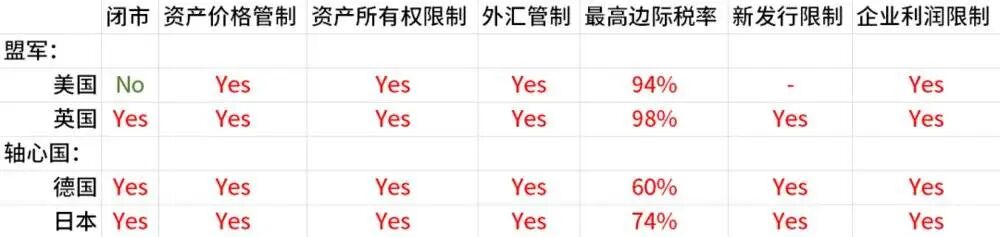 除了控制经济活动,美国和其他参战国家对资产也有严苛的限制,涉及到税收水平。与此同时,还有外汇控制,以防止资金外流,并限制个人可以持有的资产(例如,在美国和许多其他参战国,个人持有黄金是非法的)。对于仍然存在的有限对外贸易,几乎不可能转换所涉及的货币——例如,英国要求其贸易伙伴(主要是英联邦国家),不可兑回因贸易顺差所累积的英镑。