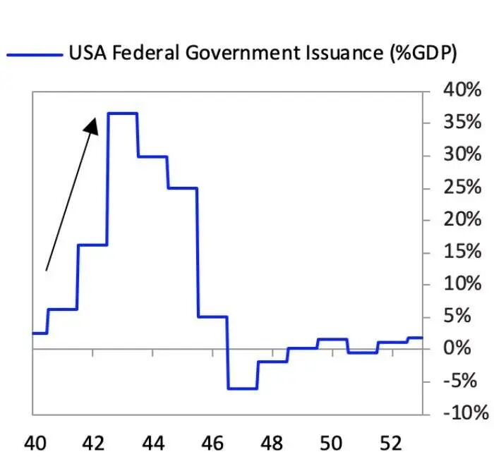 通过这种方式,美联储的第二次世界大战收益率目标控制计划(Fed’s WWII yield targeting program )间接消解了有史以来最大的政府财政赤字扩张之一(one of the biggest government fiscal deficit expansions ever)。 尽管整件事情是发生在“全面战争导致经济彻底转型”的非常规背景之下,但这种通过政策控制收益率的力量,以支持和振兴经济的操作,仍然具有很大的启发性。在第二次世界大战的情况下,正是这种政策刺激最终使经济脱离了大萧条时代。您可以看到发行量激增如何为战争提供资金(上图),使得到战争结束时政府债务增加到了GDP的70%(下图)。