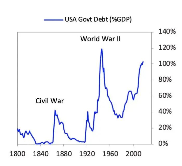 战争期间的经济可能是最适合解释当下情况的案例。在那种情况下,随着政府在战争上的支出大量增加,所有国家的所有决策者都增加了税收,借贷和货币发行。这就是他们在这种情况下总是会做的。这个不用我多说。